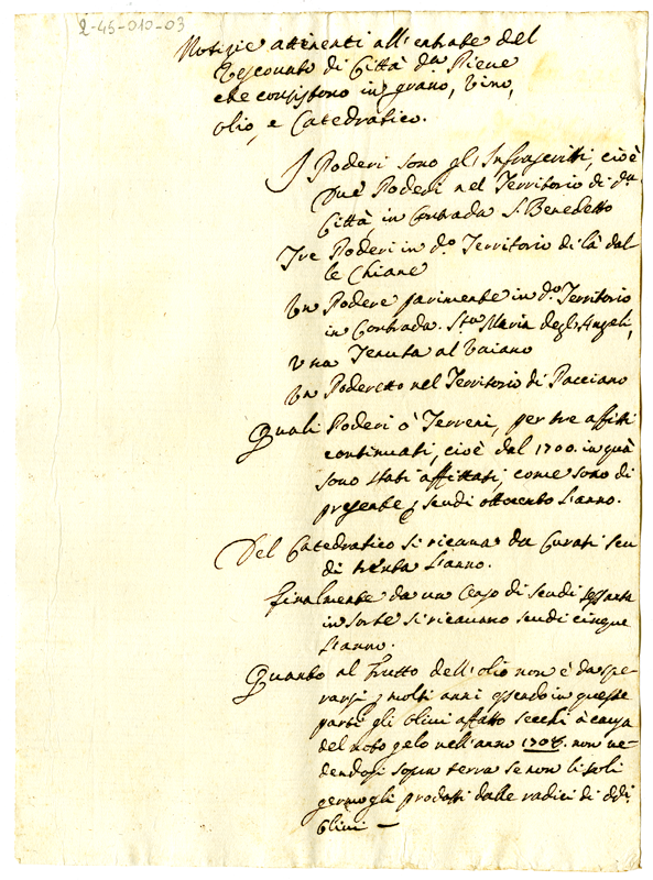 Notizie attinenti all'entrate del Vescovato di Città della Pieve che consistono in grano, vino, olio, e catedratico (1700-1721)