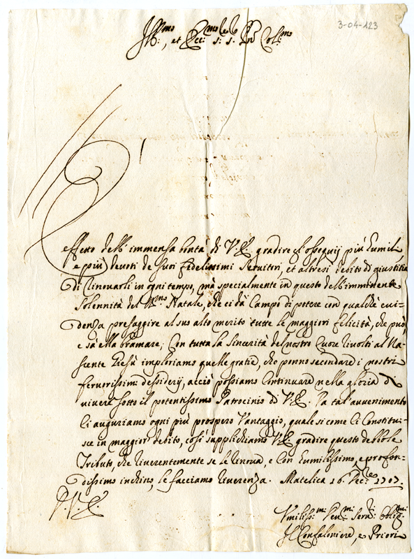 Lettera del confaloniere e priori di Matelica ad Annibale Albani (1707 dicembre 16)