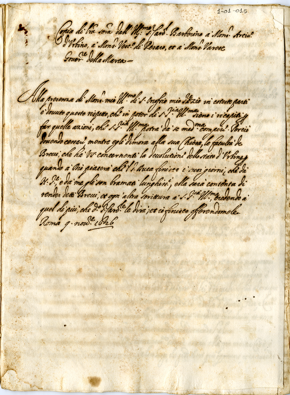 Copia di lettera scritta dall'Illustrissimo S. Cardinale Barberino a Monsignor Arcivescovo di Urbino, a Monsignor Vescovo di Pesaro, et a Monsignor Varese governatore della Marca (1626 novembre 9)