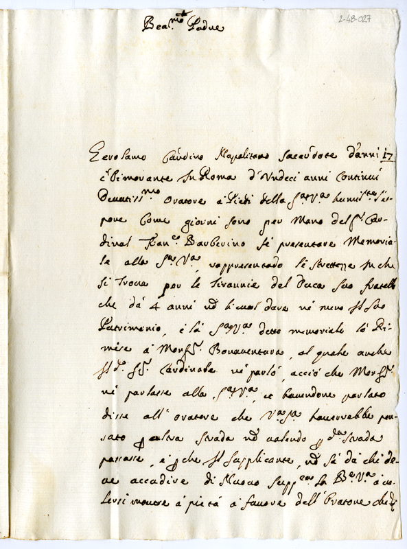Lettera di Gerolamo Cardino sacerdote napolitano di anni 17 a papa Clemente XI (1700-1721)