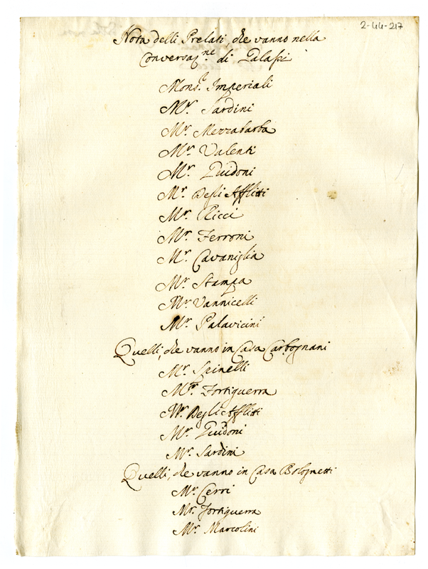 Nota delli Prelati, che vanno nella Conversazione di Galassi (1700-1721)