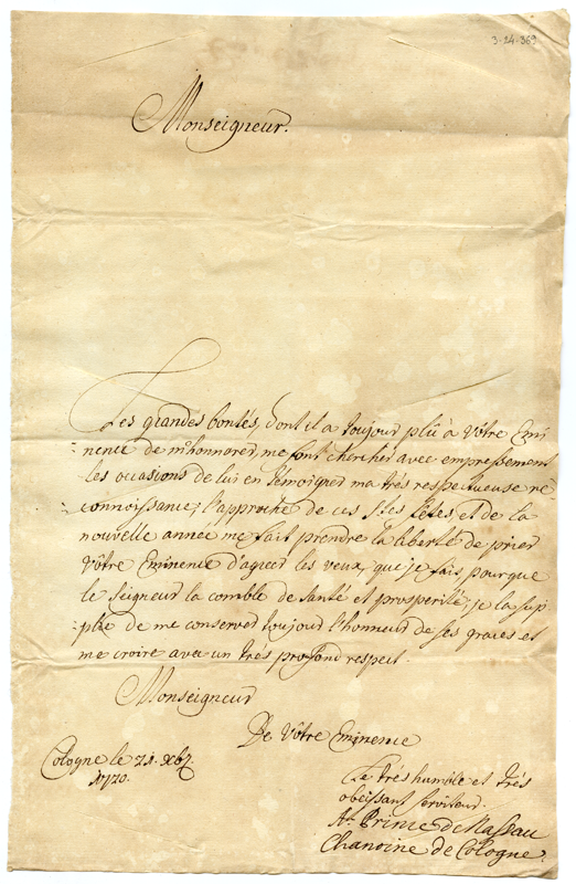 Lettera del principe di Nassau cononico di Colonia al cardinale Annibale Albani (1720 dicembre 21)