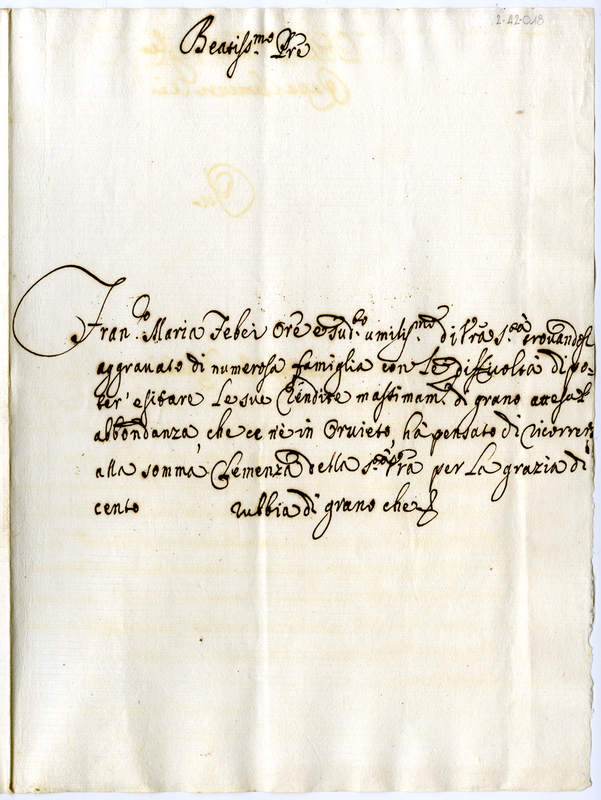 Chiede di poter avere per grazia cento rubbia di grano trovandosi in difficoltà