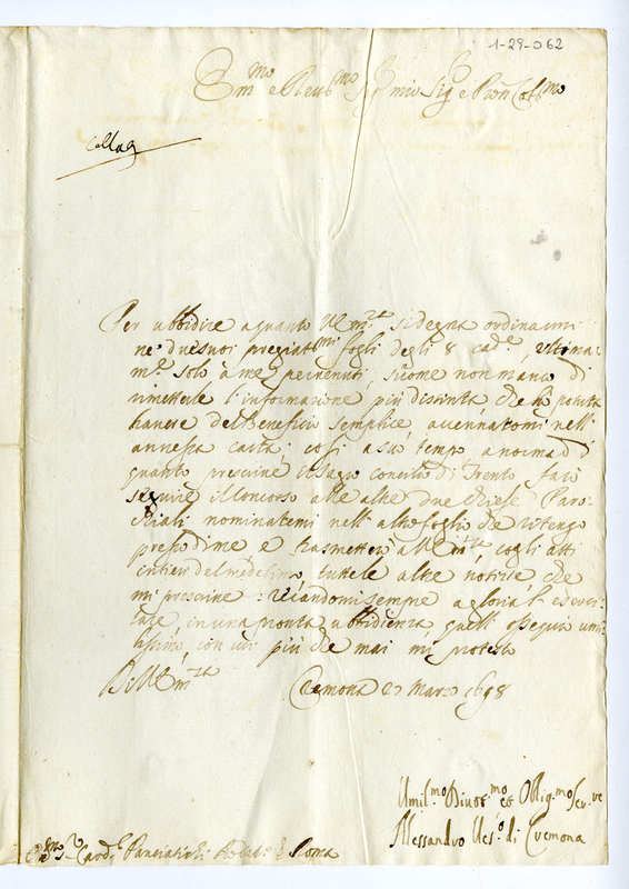 Lettera di Alessandro vescovo di Cremona al cardinale Panciatichi (1698 marzo 25)