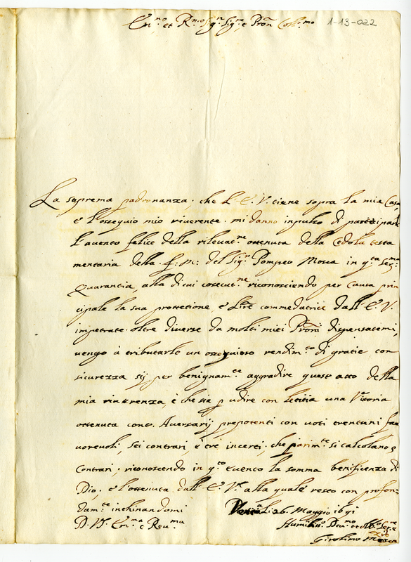 Lettera di Girolimo Mosca a Giovanni Francesco Albani (1691 maggio 26)