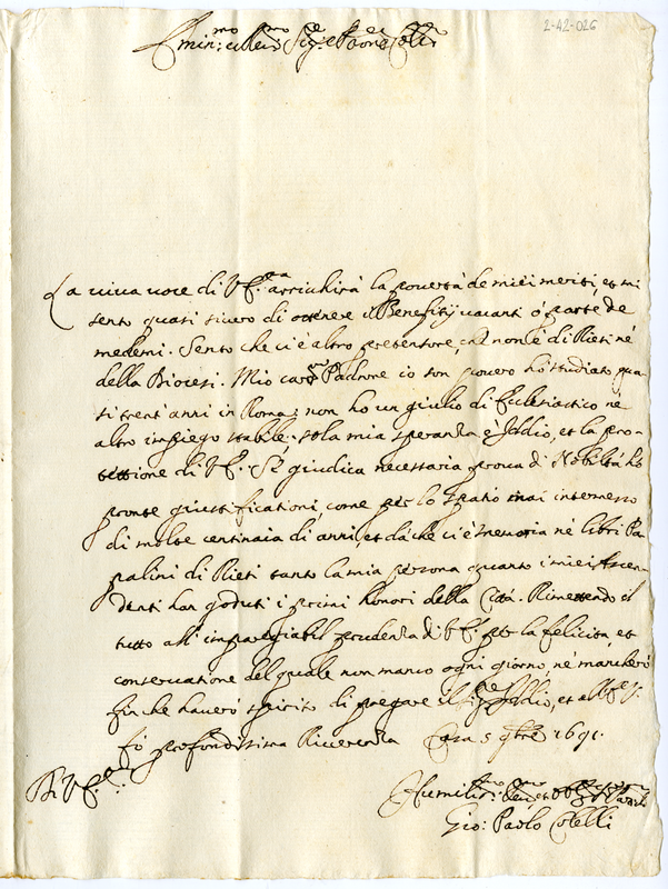 Lettera di Giovanni Paolo Colelli al cardinale Albani (1691 novembre 5)
