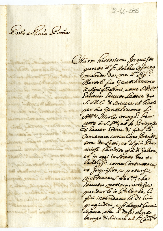 L'ambasciatore cesareo fa sapere da parte di sua maestà cattolica di iscrivere nel ruolo di suo gentiluomo l'abate Nicola Orenghi. Lo scrivente risponde di farlo carcerare come pernicioso bandito in contumacia