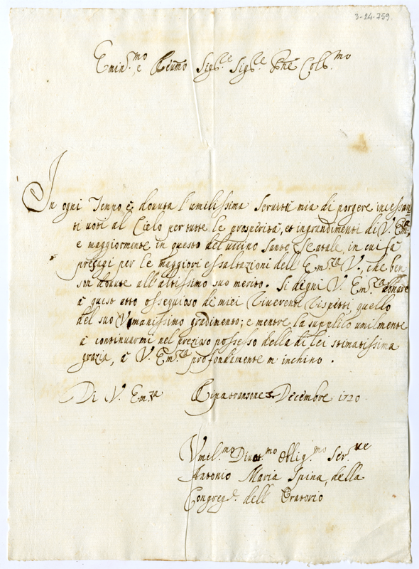 Lettera di Antonio Maria Spina al cardinale Annibale Albani (1720 dicembre 3)