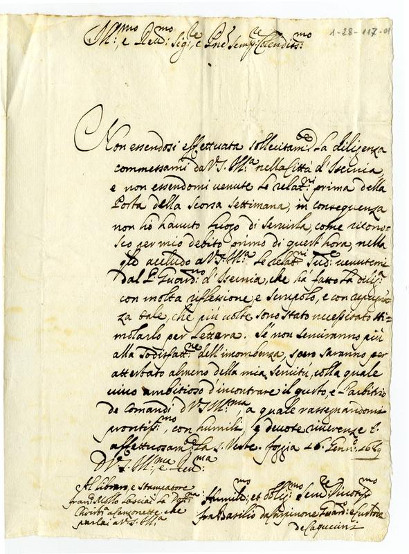 Lettera del padre Guardiano e Custode dei Cappuccini della città di Foggia a un Monsignore (1689 gennaio 16)