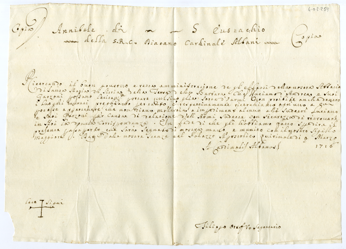 Copia di patente di porto d'armi lecite conferito dal Cardinale Annibale Albani a Luciano d'Andrea e suoi familiari (1716 marzo ..)