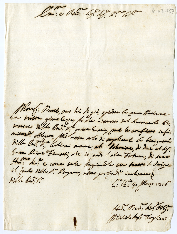 Lettera di Michele Agostino Togliari al Cardinale Annibale Albani (1716 marzo 30)