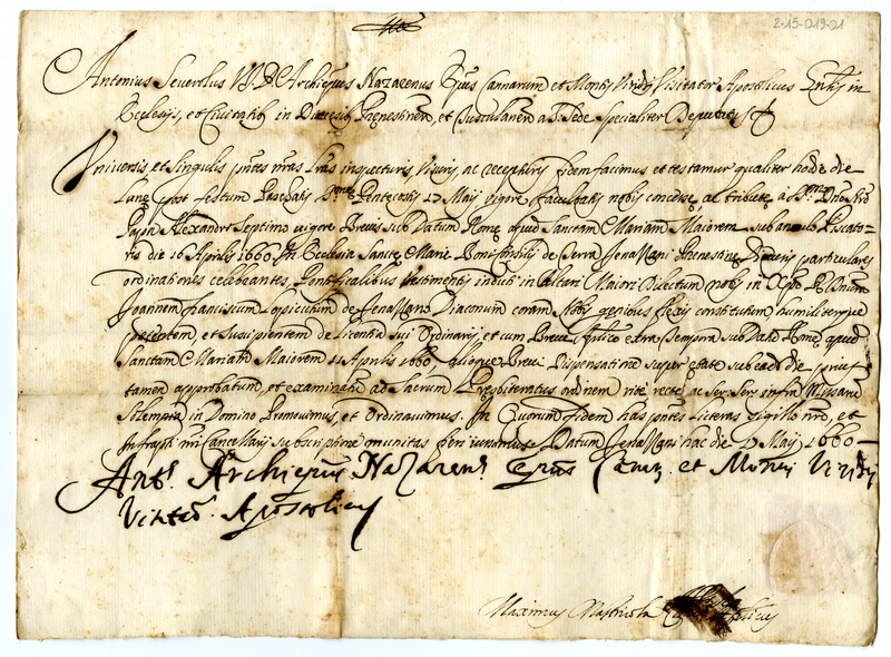 Attestato del vescovo di Canne visitatore apostolico della diocesi di Palestrina (1660 maggio 17)