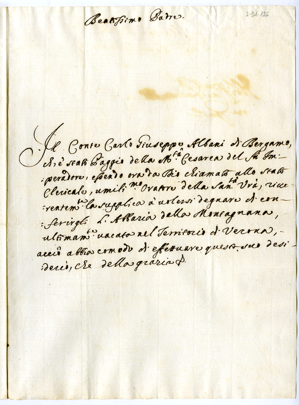Lettera del conte Carlo Giuseppe Albani di Bergamo a papa Clemente XI (1700-1721)