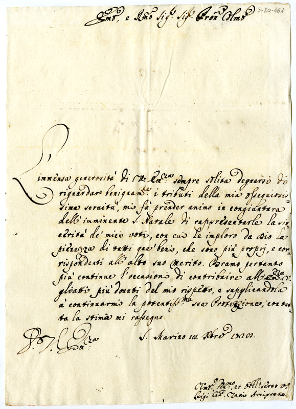 Lettera di Luigi Zani arciprete al cardinale Annibale Albani (1728 dicembre 18)