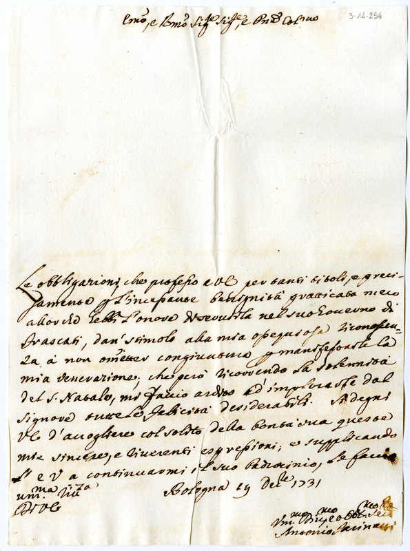 Lettera di Antonio Farinacci al cardinale Annibale Albani (1731 dicembre 29)