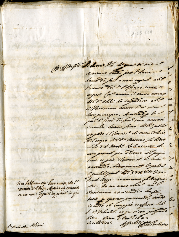 Lettera del cardinale Barberini Francesco senior a Malatesta Albani (1643 ottobre 5)