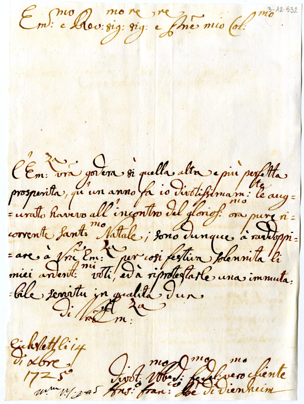 Lettera di Antonio Francesco abate di Dienheim al cardinale Annibale Albani (1725 dicembre 14)