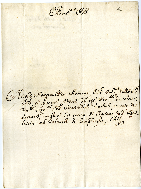 Nicola Hargenuillier chiede che gli venga assegnata la carica di Capitano delle appellazioni nel tribunale del Campidoglio