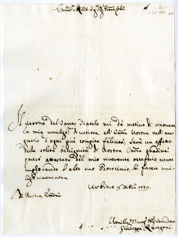 Lettera di Giuseppe Rangoni al cardinale Annibale Albani (1729 dicembre 16)