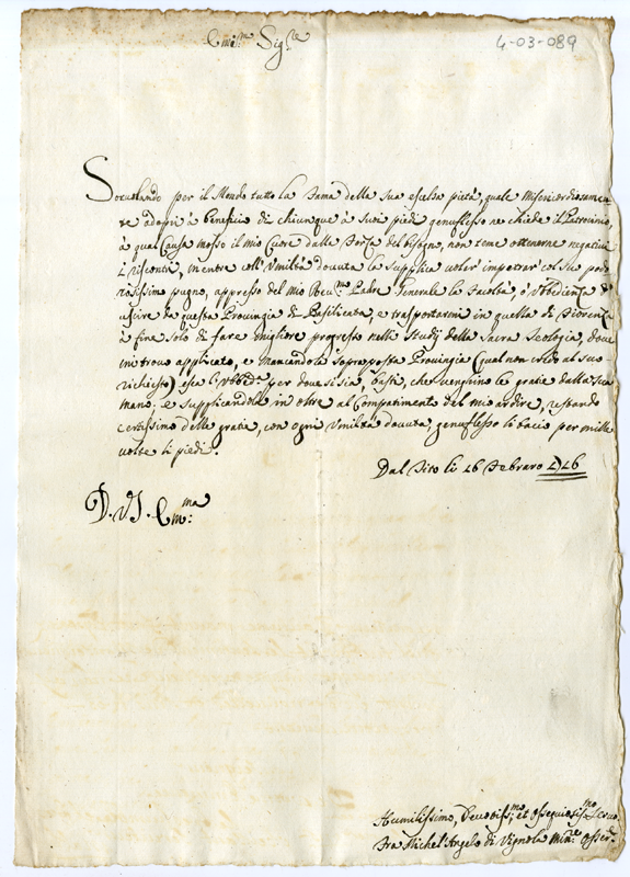 Lettera di fra Michel'Angelo di Vignola al Cardinale Annibale Albani (1716 febbraio 16)