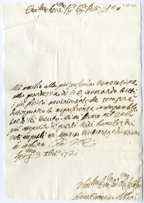 Lettera di Giovanni Domenico Albani al cardinale Annibale Albani (1721 dicembre 3)