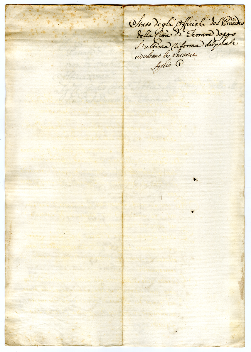 Stato degli Officiali del Presidio della città di Ferrara doppo l'ultima riforma dal quale risultano le vacanze. Foglio G (1709-1721)
