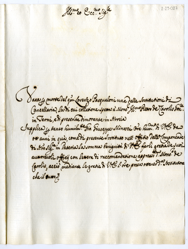 E' vacante una delle sostituzioni di cancellaria per morte di Lorenzo Pasqualoni, l'orante chiede di esserne graziato