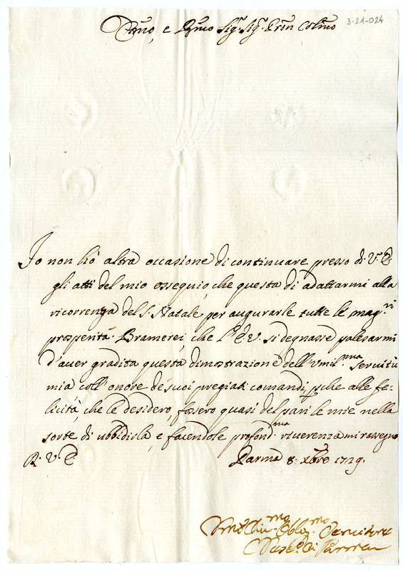 Lettera del vescovo di Parma al cardinale Annibale Albani (1729 dicembre 8)