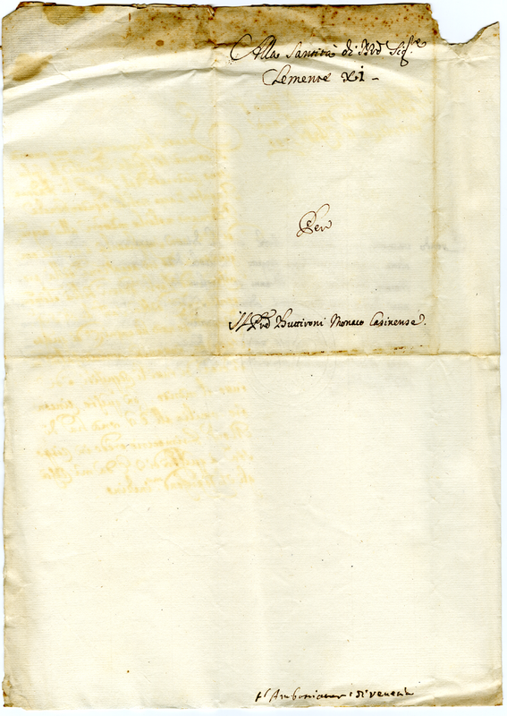 Supplica a Clemente XI a favore del monaco di Cassino Buttironi per la chiesa vacante di Arbe scritta dall'Ambasciatore dello stato di Venezia.