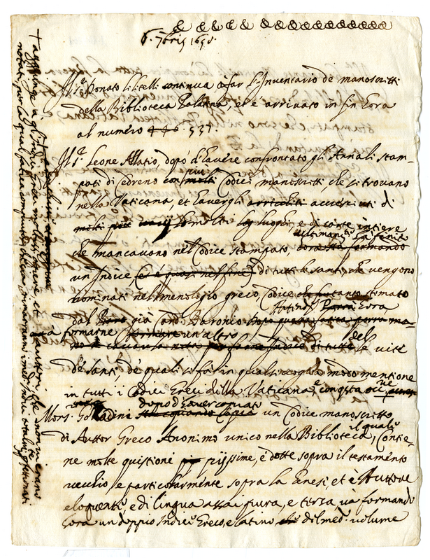 Annotazione di Annibale Albani sui collaboratori che lavorano nella Biblioteca Vaticana (1650 settembre 6)