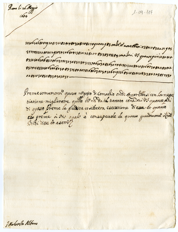 | bo.livello.titolo2 | Archivio Albani|"Lettere, e scritture, dalle quali appariscono Li Servigij fedelmente resi alla Sede Apostolica da Malatesta Albani sotto il Pontificato d'Urbano Ottavo, tanto in tempo di Guerra, quanto in tempo di pace alla Sua morte seguita in Francia Li 7 Ottobre 1645. Distintamente indicate ne seguenti fogli"|"Lettere del Cardinale Francesco Barberini scritte da Roma nelli mesi di Maggio, Giugno,Luglio, ed Agosto 1644 in piano, e in cifra à Malatesta Albani in Parigi con la discifrazione delle seconde di mano dell'istesso Malatesta Albani dalle quali appariscono le gravi commissioni date al medesimo da eseguirsi nella Corte di Francia per servizio della Sede Apostolica"|"Lettere in piano e in cifra del Signor Cardinale Francesco Barberini, scritte da Roma à Malatesta Albani in Parigi nel mese di maggio 1644, con la discifrazione delle seconde di mano dell'istesso Malatesta Albani (1644 maggio)"|Documenti contenuti | |