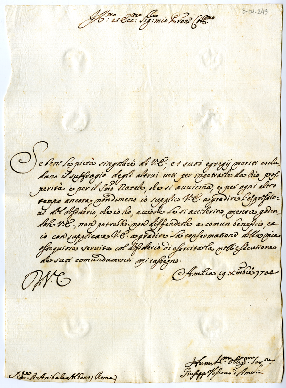 Lettera di Giuseppe vescovo di Amelia ad Annibale Albani (1704 dicembre 29)