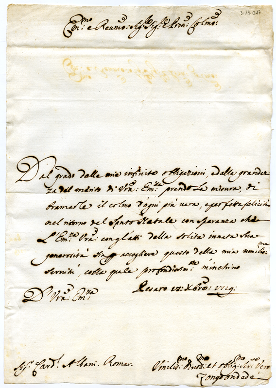 Lettera di Zongo Ondedei al cardinale Annibale Albani (1719 dicembre 17)