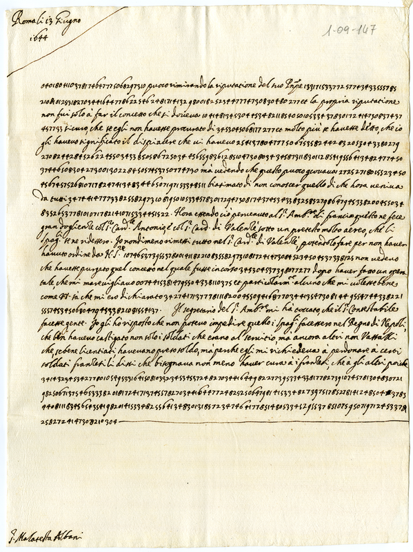 Lettera del cardinale Barberini Francesco senior a Malatesta Albani (1644 giugno 13)