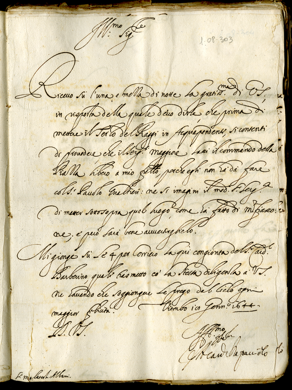 Lettera del cardinale Rapaccioli Francesco Angelo a Malatesta Albani (1644 gennaio 18)