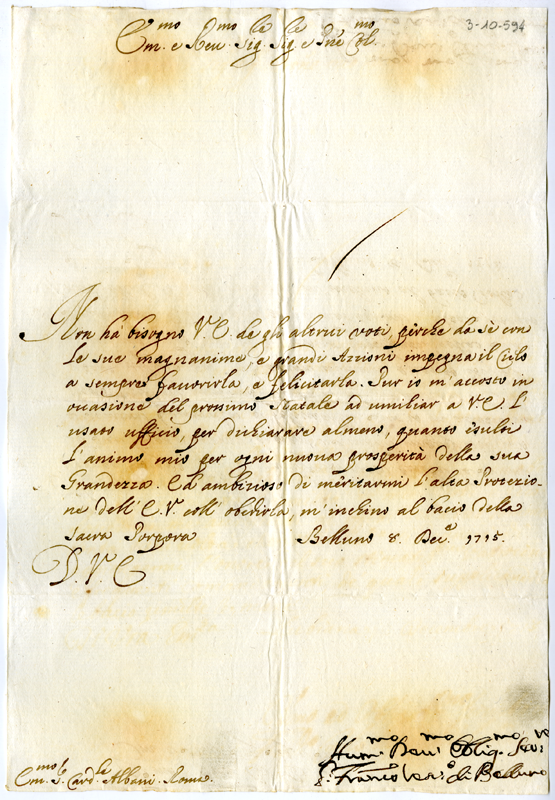 Lettera di Gianfrancesco vescovo di Belluno al cardinale Annibale Albani (1715 dicembre 8)