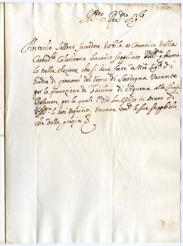 Lettera di Antonio Sellent, sacerdote e canonico della cattedrale cagliaritana a Monsignor Olivieri (1700-1715)
