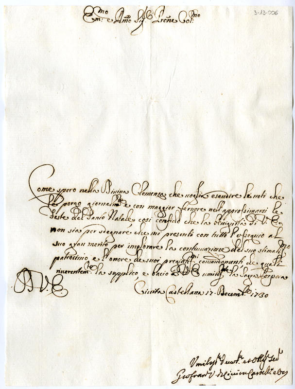 Lettera di Giovanni Francesco vescovo di Civita Castellana al cardinale Annibale Albani (1730 dicembre 17)