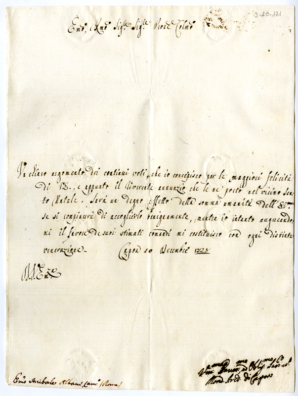 Lettera di Mondilio arcivescovo di Capua al cardinale Annibale Albani (1728 dicembre 10)