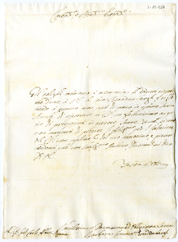 Lettera di Barbara Costanza Brandemberghi ad Annibale Albani (1719 dicembre 16)