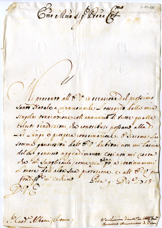 Lettera di Francesco arcivescovo di Pisa al cardinale Annibale Albani (1715 dicembre 9)