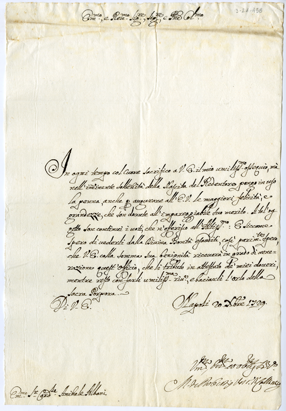 Lettera di M. de Robertis vescovo al cardinale Annibale Albani (1729 dicembre 20)