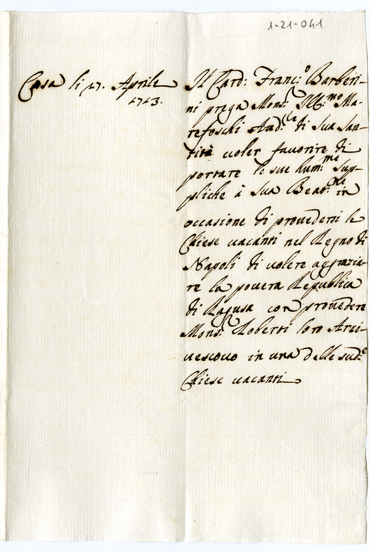 Lettera del cardinale Francesco Barberini junior a monsignor Marefoschi (1713 aprile 27)
