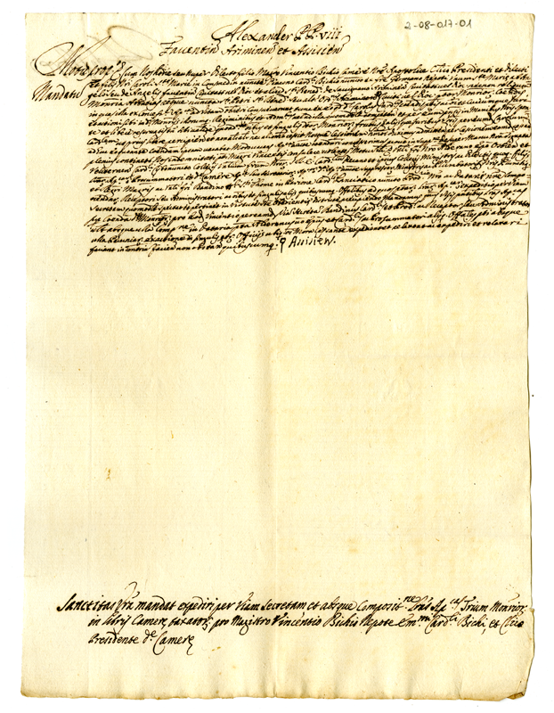 Motu proprio di Papa Alessandro VIII circa la spedizione per via segreta dei titoli conferiti al maestro Vincenzo Bichi nipote dell'eminentissimo cardinale Bichi (1691)