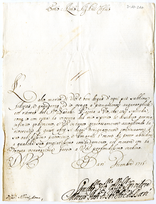 Lettera di Muzio arcivescovo di Bari al cardinale Annibale Albani (1715 dicembre)