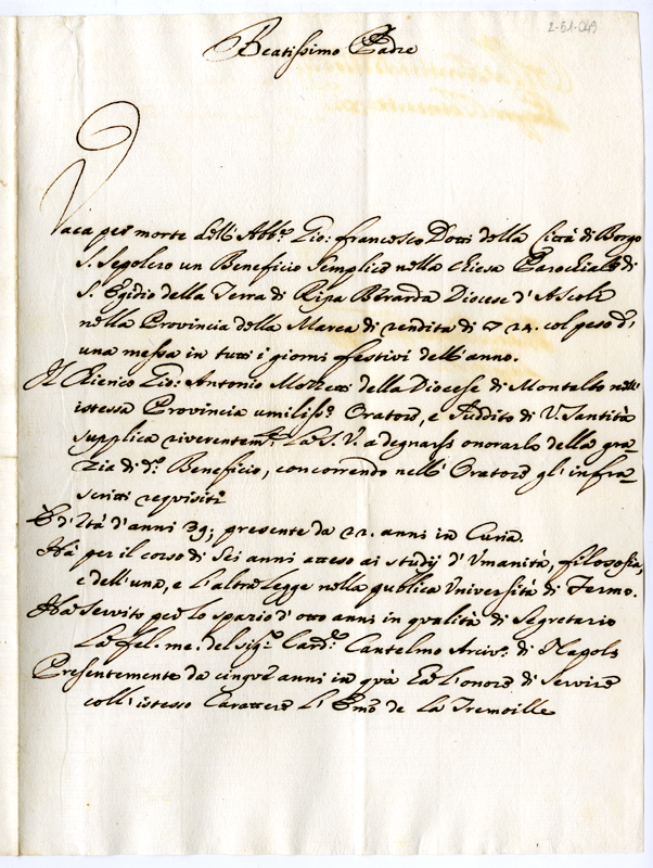 Lettera del chierico Giovanni Antonio Mozzetti a papa Clemente XI (1700-1721)