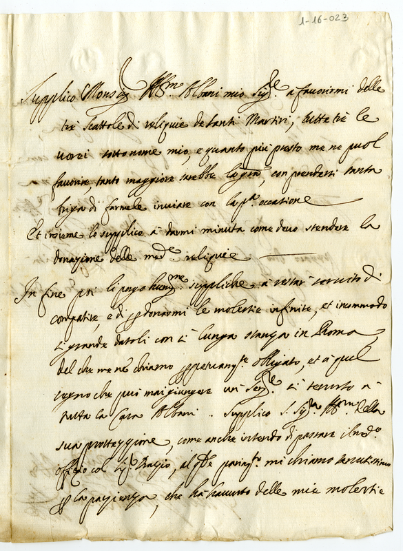 Chiede di avere al più presto le tre scatole di reliquie dei santi martiri e di fargli sapere a chi donarle. Ringrazia per l'incomodo dato con la sua lunga permanenza a Roma