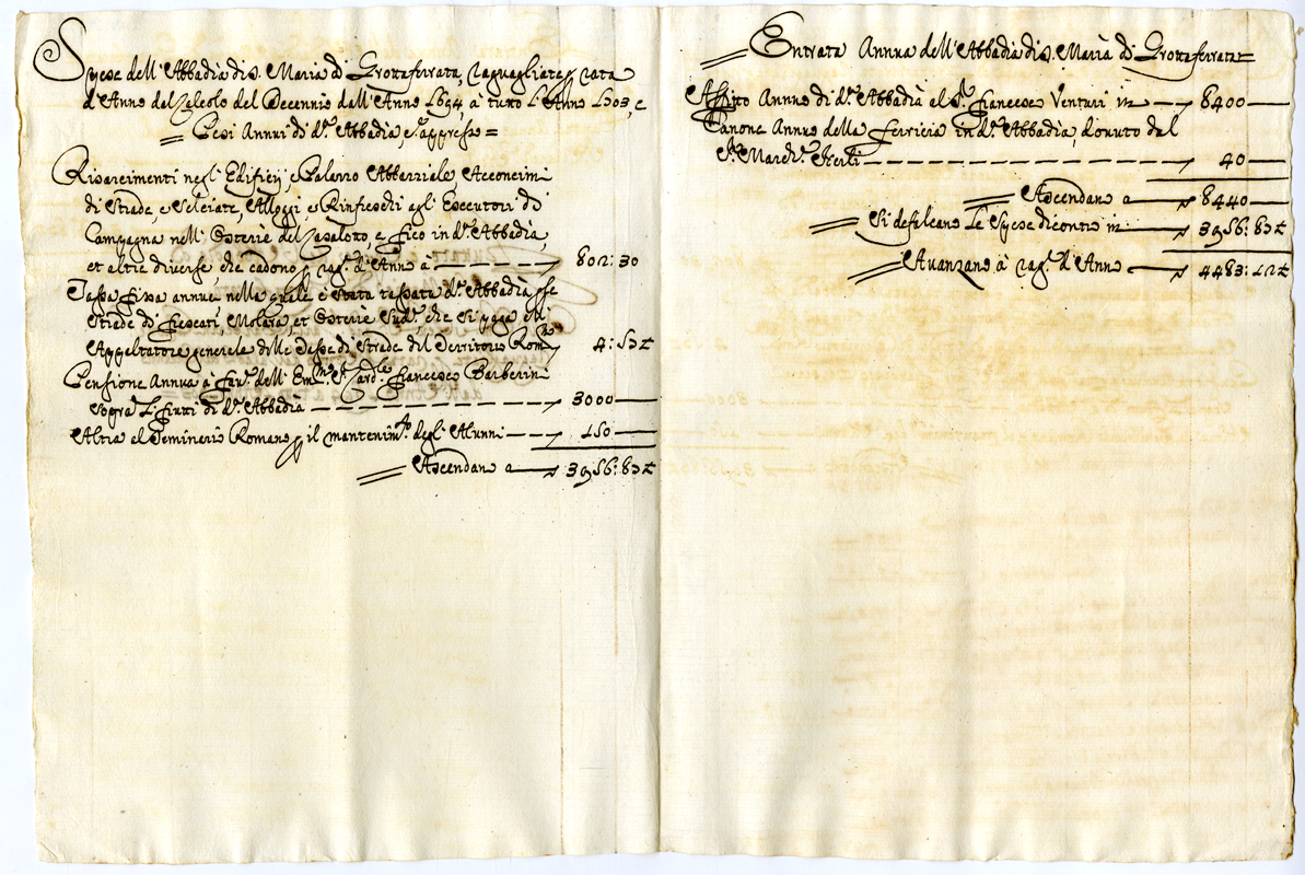 Fruttato e Spese dell'Abbadia di Santa Maria di Grottaferrata dell'Eminentissimo e Reverendissimo Cardinale Carlo Barberini raguagliate per rata d'anno del calcolo del decennio dall'anno 1694 a tutto l'anno 1703