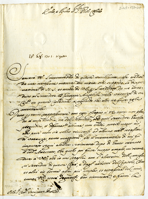 Lettera del vescovo di Ferentino al cardinale Sacripanti (1701 giugno 15)