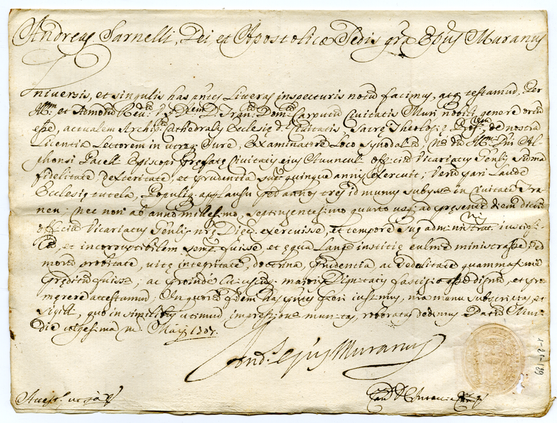 Attestato di Andrea Sarnelli vescovo di Muro a favore di Francesco Domenico Carputi (1707 maggio 31)